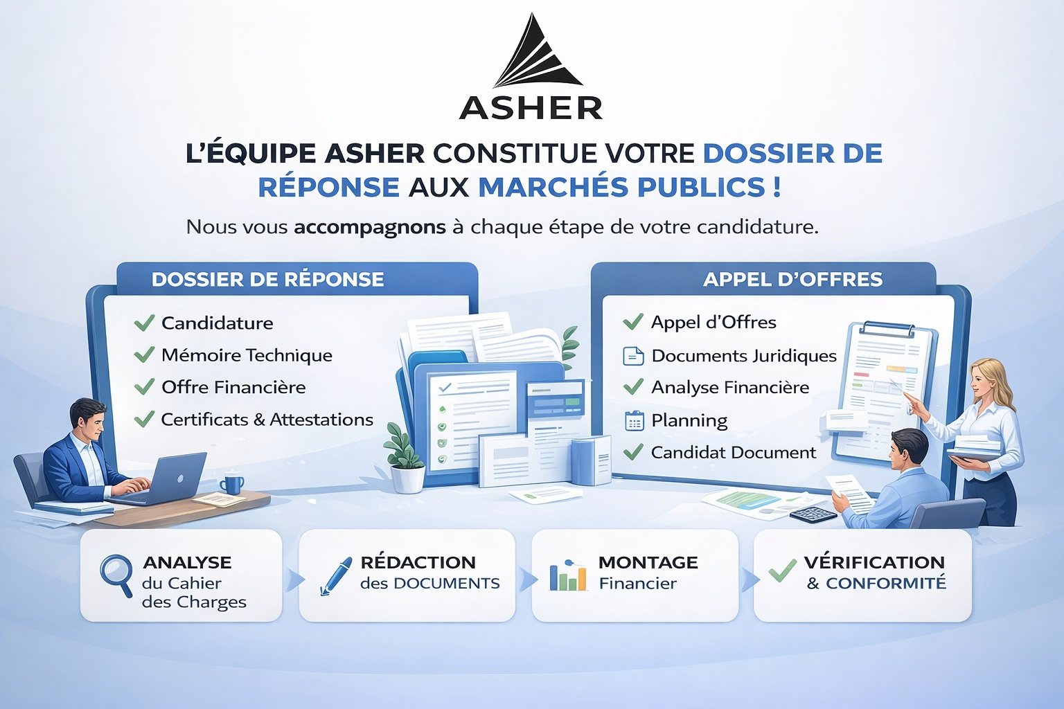 ASHER vous accompagne dans la préparation de vos réponses aux marchés publics avec expertise et rigueur.